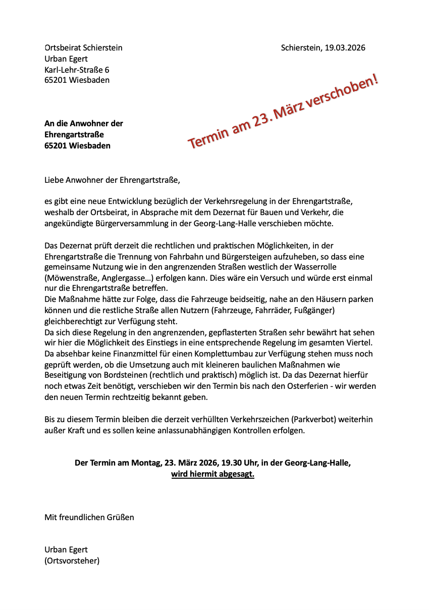 Für die Parksituation in der Ehrengartstraße gibt es neue Entwicklungen. Die ursprünglich für den 23. März 2026 geplante Bürgerversammlung wird darum in Abstimmung mit dem Dezernat für Bauen und Verkehr auf einen Termin zeitnah nach Ostern verschoben. Hintergrund ist eine derzeit laufende Prüfung durch das Dezernat, inwieweit die bestehende Trennung zwischen Fahrbahn und Gehwegen in der Ehrengartstraße aufgehoben werden kann.
