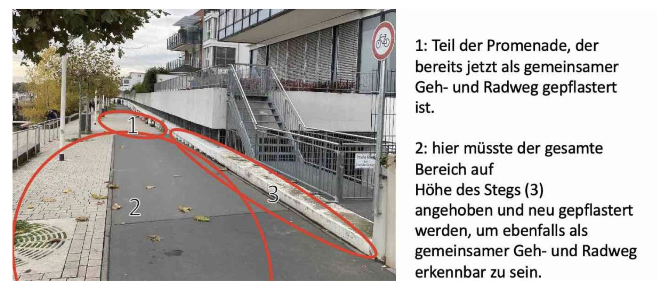 Rheingaustraße? Der Ortsbeirat wollte klären, ob der Weg vom Kormoranweg zur Promenade noch barrierefrei gestaltet werden kann. Ein barrierefreier Weg von der mehrere hundert Meter entfernten Rheingaustraße, an der auch üblicherweise nur wenige Spaziergänger zu finden sind, hilft uns hier wenig weiter. Vielleicht muss der Schiersteiner Ortsbeirat das nochmal genauer darstellen und erhält dann hoffentlich früher Antwort.